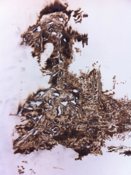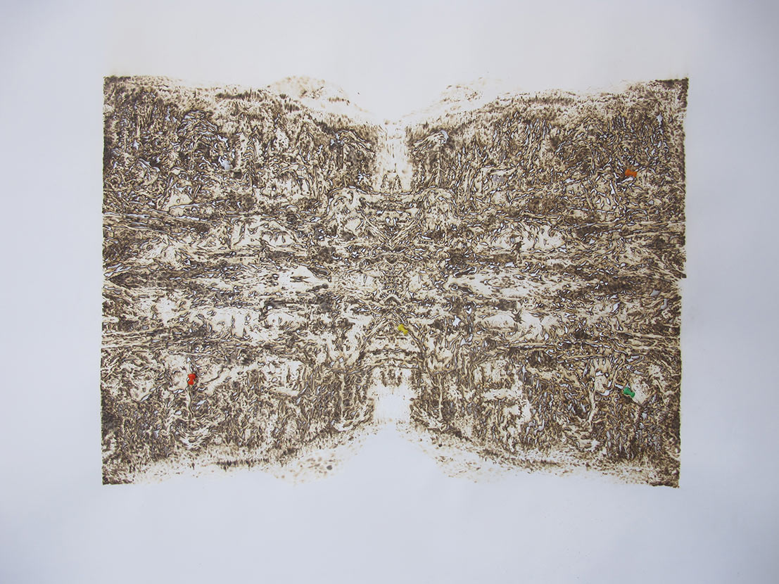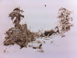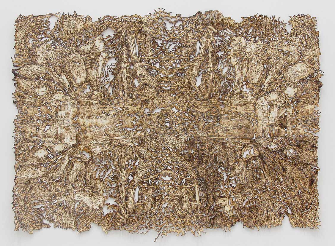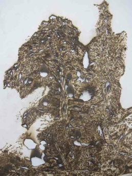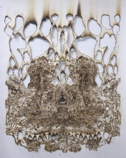 The burnt drawings often use a symmetrical layout whereby each pictorial element reflects in itself as if seen through a necessarily dysfunctional kaleidoscope.