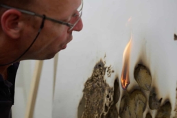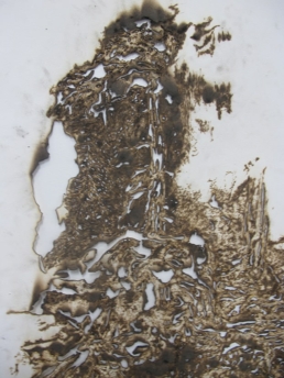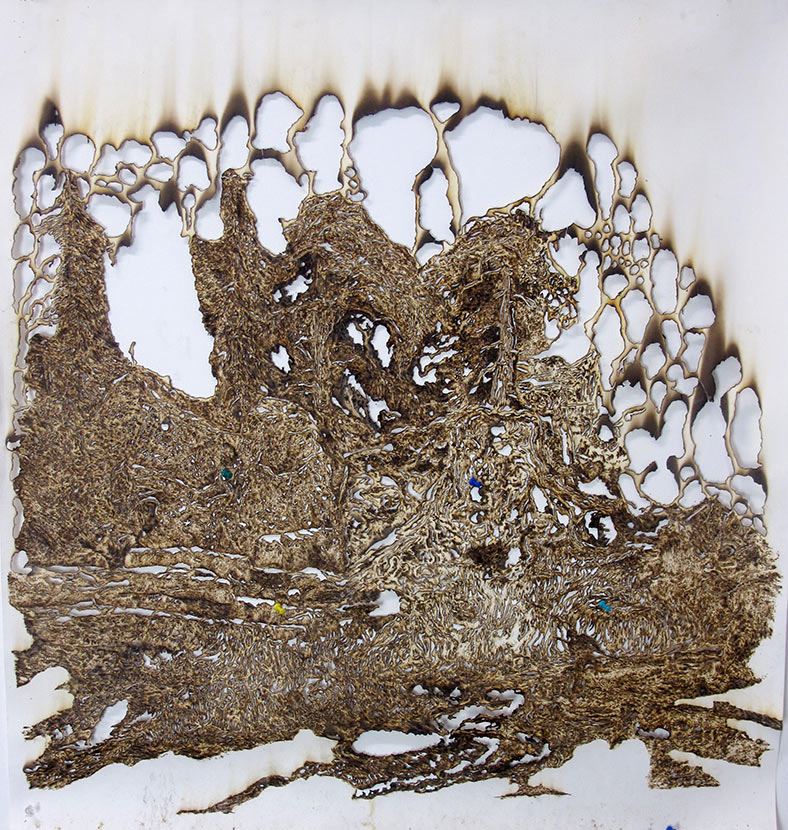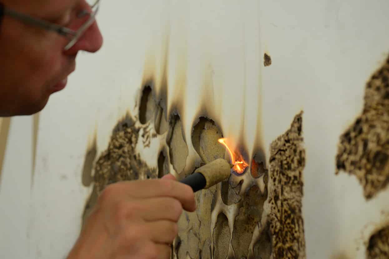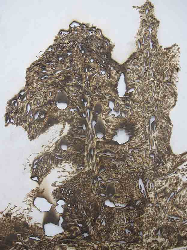 The drawings are burnt into and onto the paper, setting it alight, with all the resulting risks and problems of control.