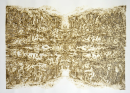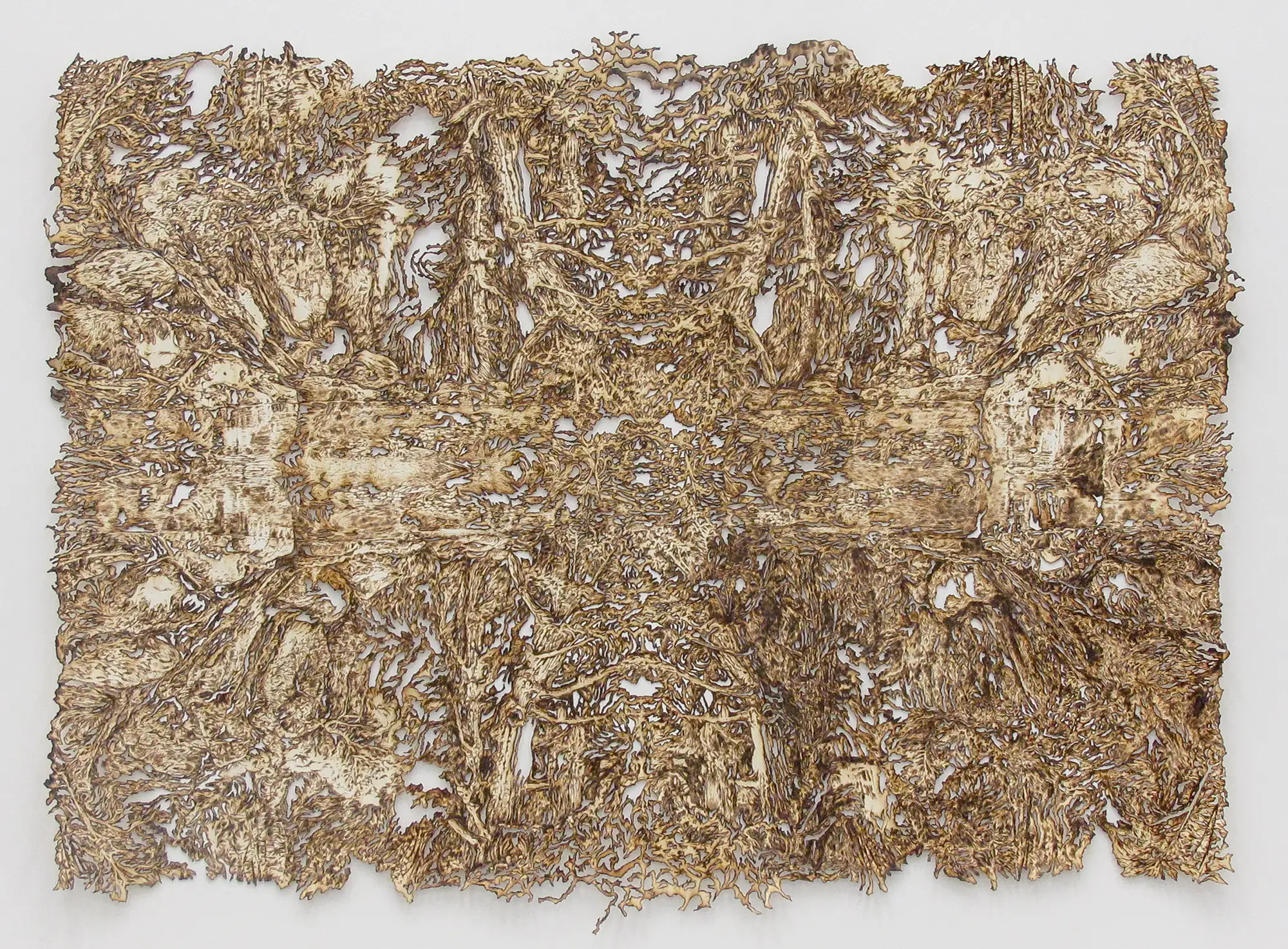 Drawings, burnings, scorching, making the act of drawing, of pictorial depiction with all its connotations simultaneously generative and destructive. The drawings are burnt into and onto the paper, setting it alight, with all the resulting risks and problems of control. The burnt drawings often use a symmetrical layout whereby each pictorial element reflects in itself as if seen through a necessarily dysfunctional kaleidoscope. The images are drawn mainly from the German 19th century Romantic movement, whereby the tension between the intimate and the infinite is echoed by the tension between creating and simultaneously destroying.