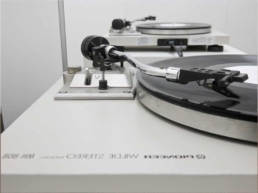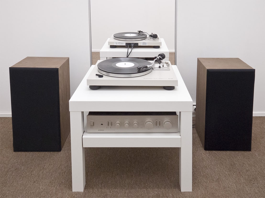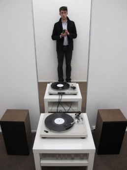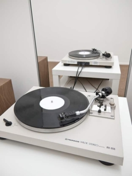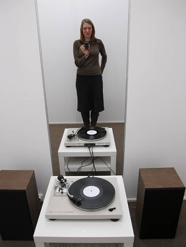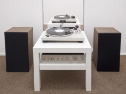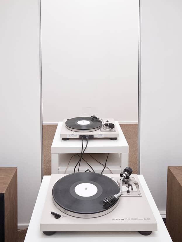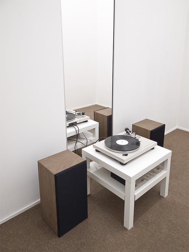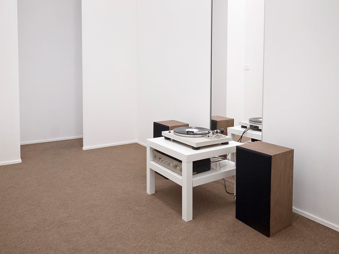 This installation is an identical mirrored double space, a spatial “mise en abyme” of the Spectator’s sense of “being there”. The only object in the room is a record player that plays the song “Each man kills the thing he loves” sung by Ingrid Caven, an exerpt from “The ballad of Reading goal”, a poem by Oscar Wilde. This music was written by Peer Raben.