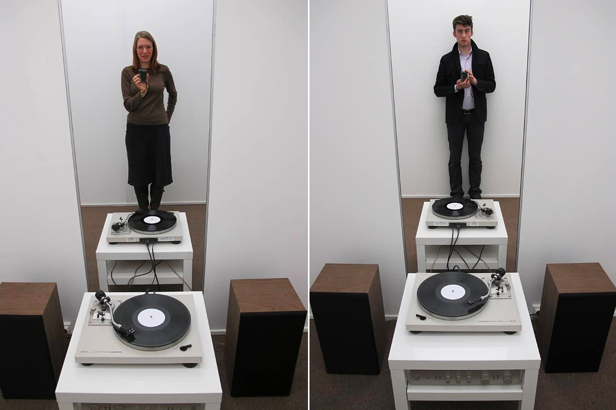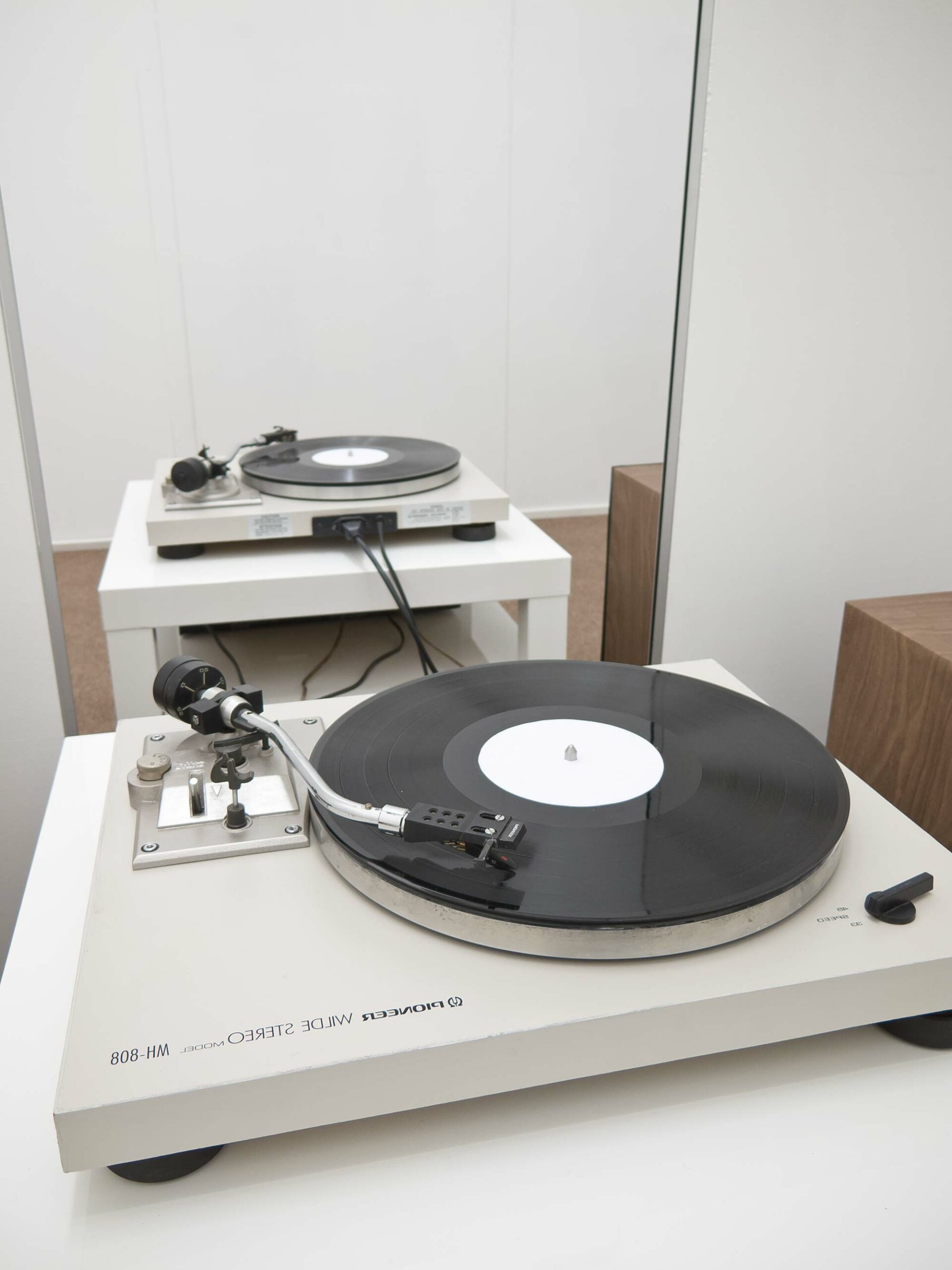 This installation is an identical mirrored double space, a spatial “mise en abyme” of the Spectator’s sense of “being there”. The only object in the room is a record player that plays the song “Each man kills the thing he loves” sung by Ingrid Caven, an exerpt from “The ballad of Reading goal”, a poem by Oscar Wilde. This music was written by Peer Raben.