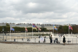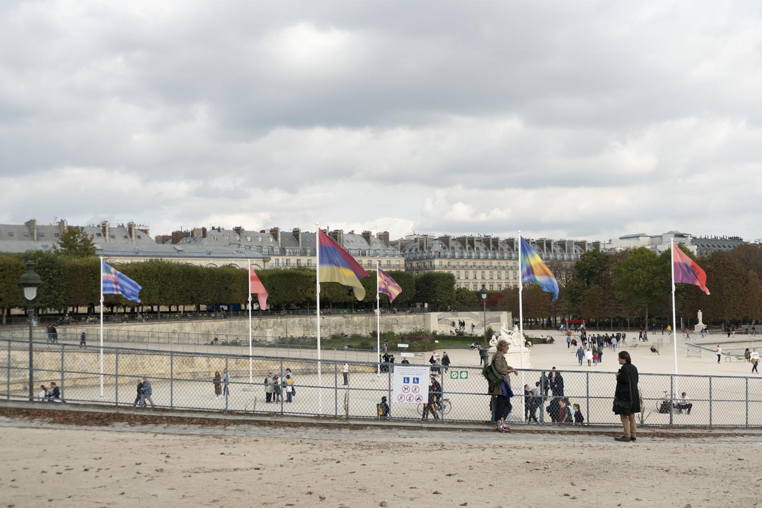 These flags of deep alliances, secret marriages, unfathomable complicities are paintings made to dance by the wind that suggest stories about identities, influences and journeys that constitute us, more so than the flags that may line the Champs-Elyses on the occasion of a parade or the visit of a head of state. The Place de la Concorde entrance of the Tuilerie gardens, in the middle of the Fer à Cheval, would therefore be the ideal context for the Empathy Flags.