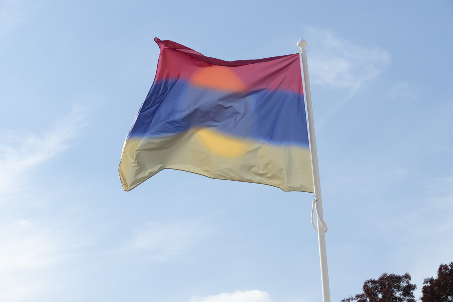 The six Empathy Flags are hybrids of national flags, layers of colours and shapes bleeding into one another making the defining characteristics of national flags, objects of affiliation and identification, become a celebration of the blurring of identity where shape, colour and movement are in a constant permutation. These coloured multilayered shades generate new infinite variations, hinting at our potential for interaction and the depth of our social experience.