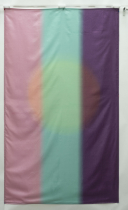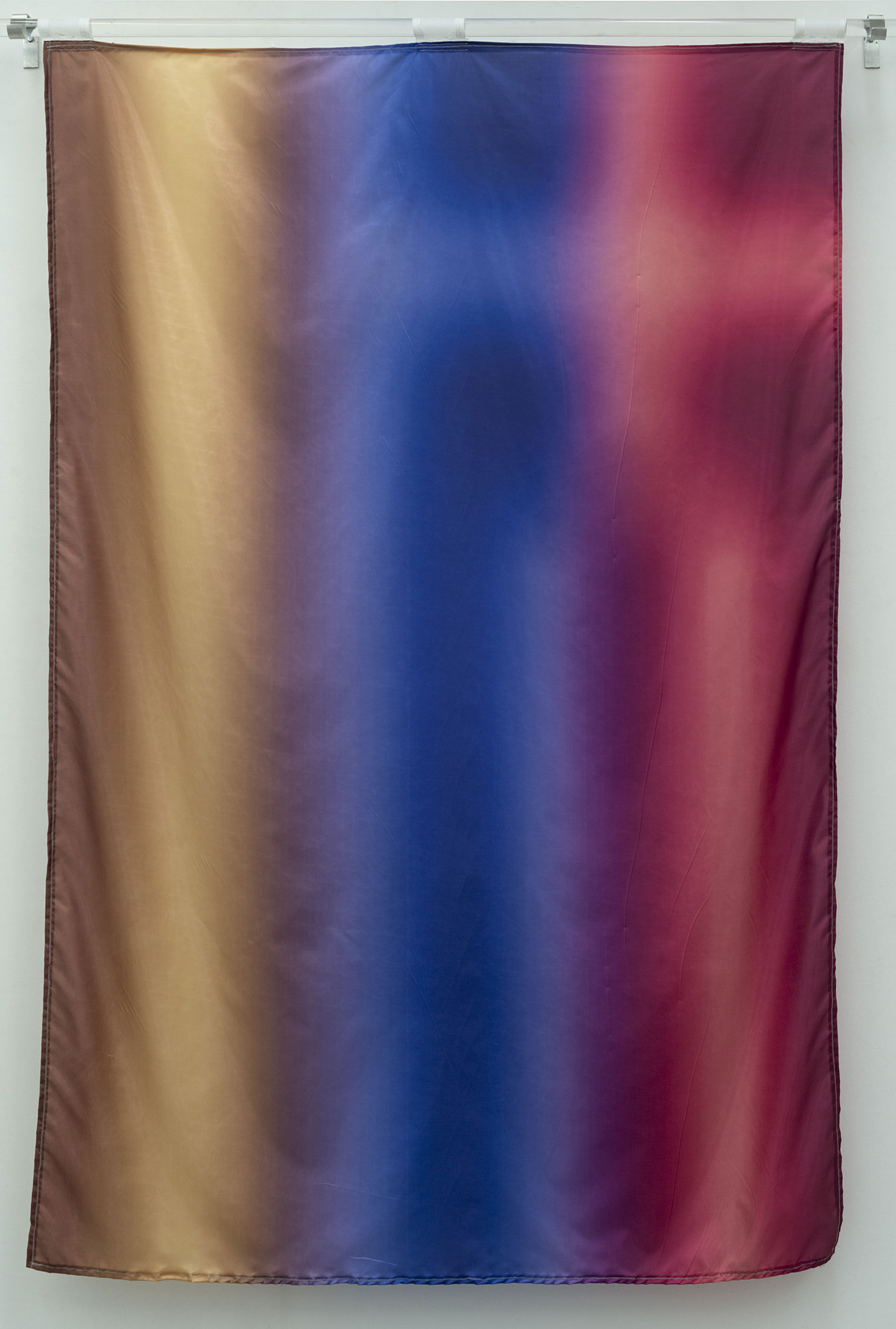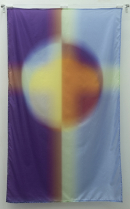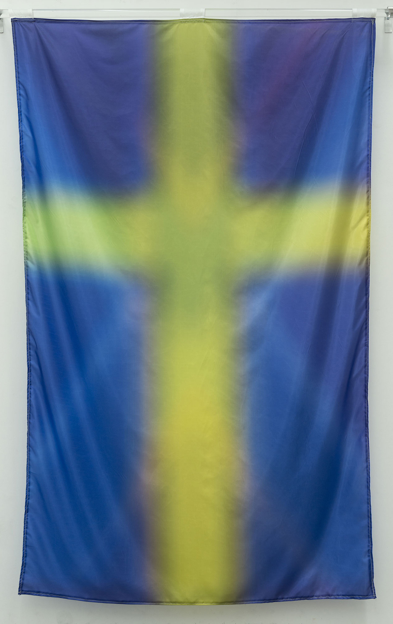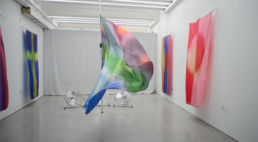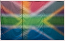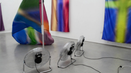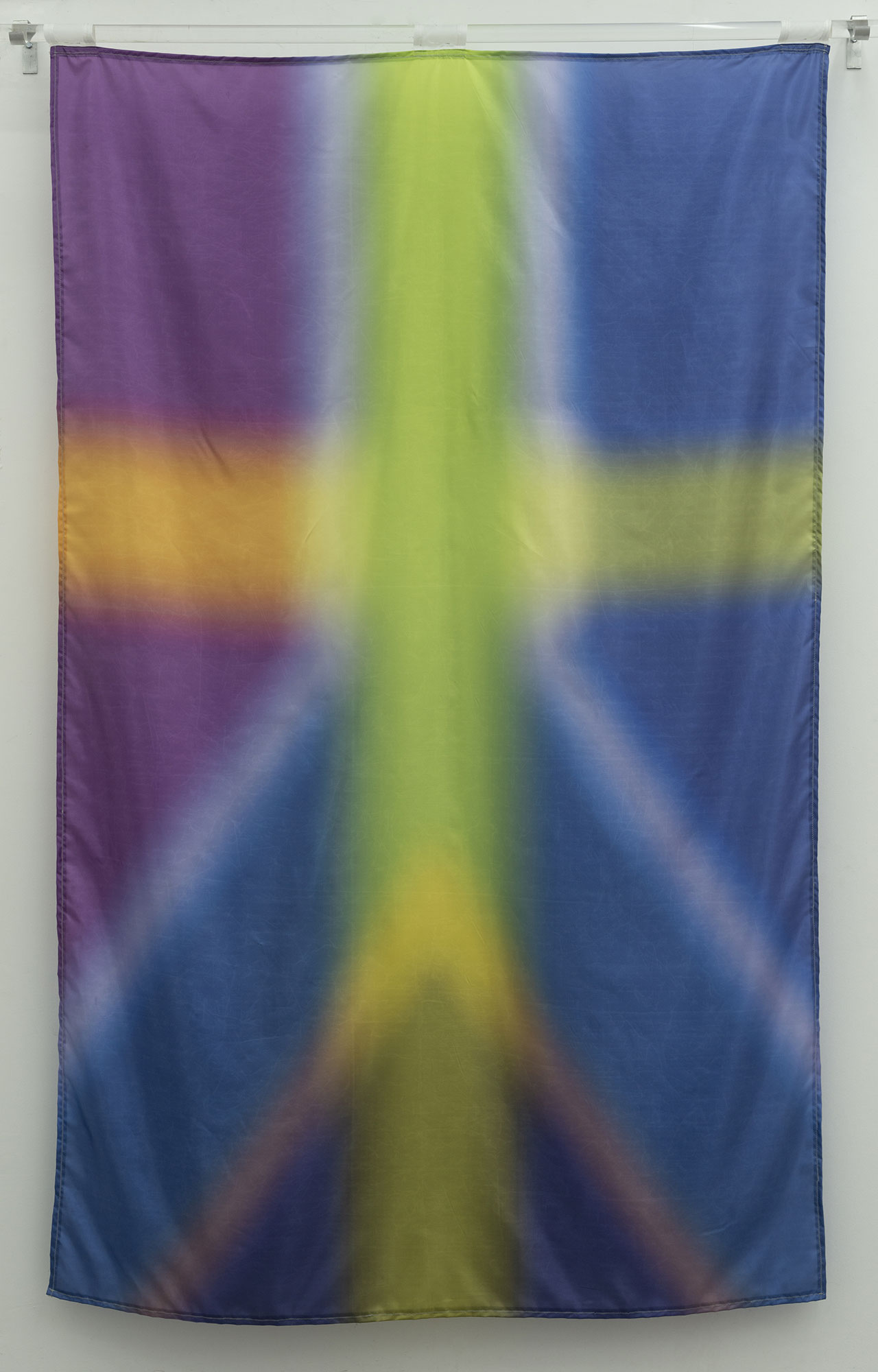 Three fans blow a large flag, animating it to twirl, twitch and billow. On the walls other flags hang, agitated by the currents of air that build up and swirl in the room. All the flags are hybrids of national flags, layers of colours and shapes bleeding into one another to the point of becoming unrecognizable. The central flag’s mesmerizing dance, heightened by the enclosed space, becomes a celebration of the blurring of identity where shape, colour and movement are in a constant permutation.