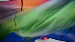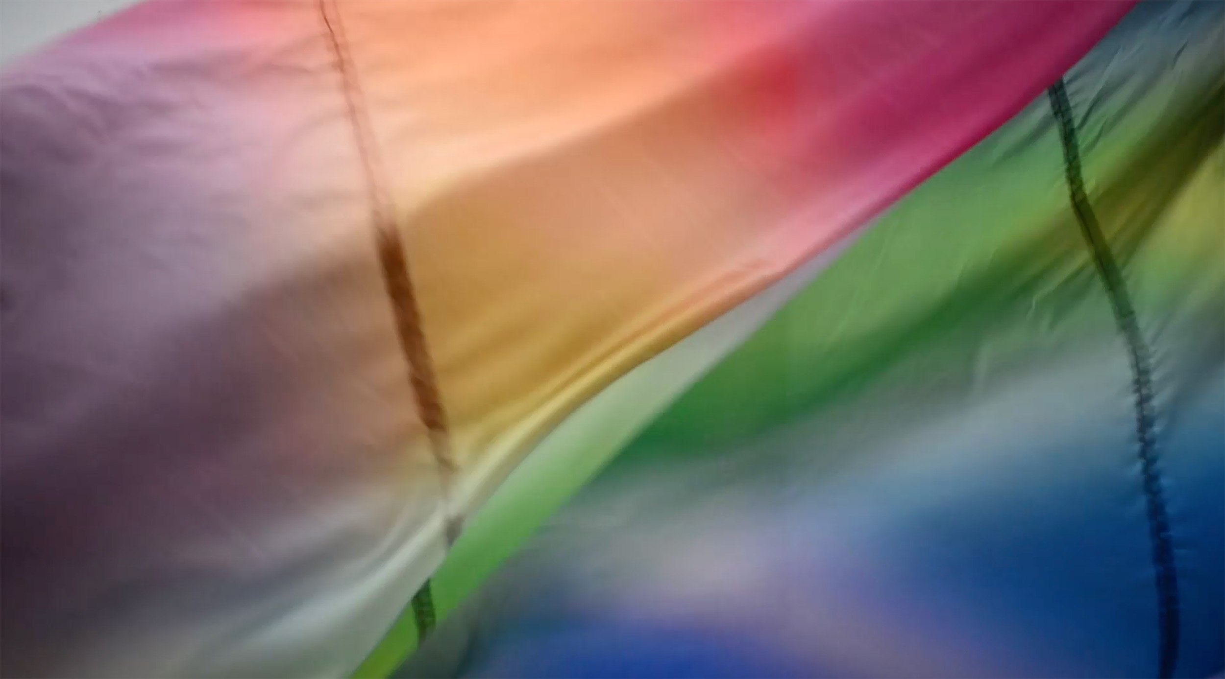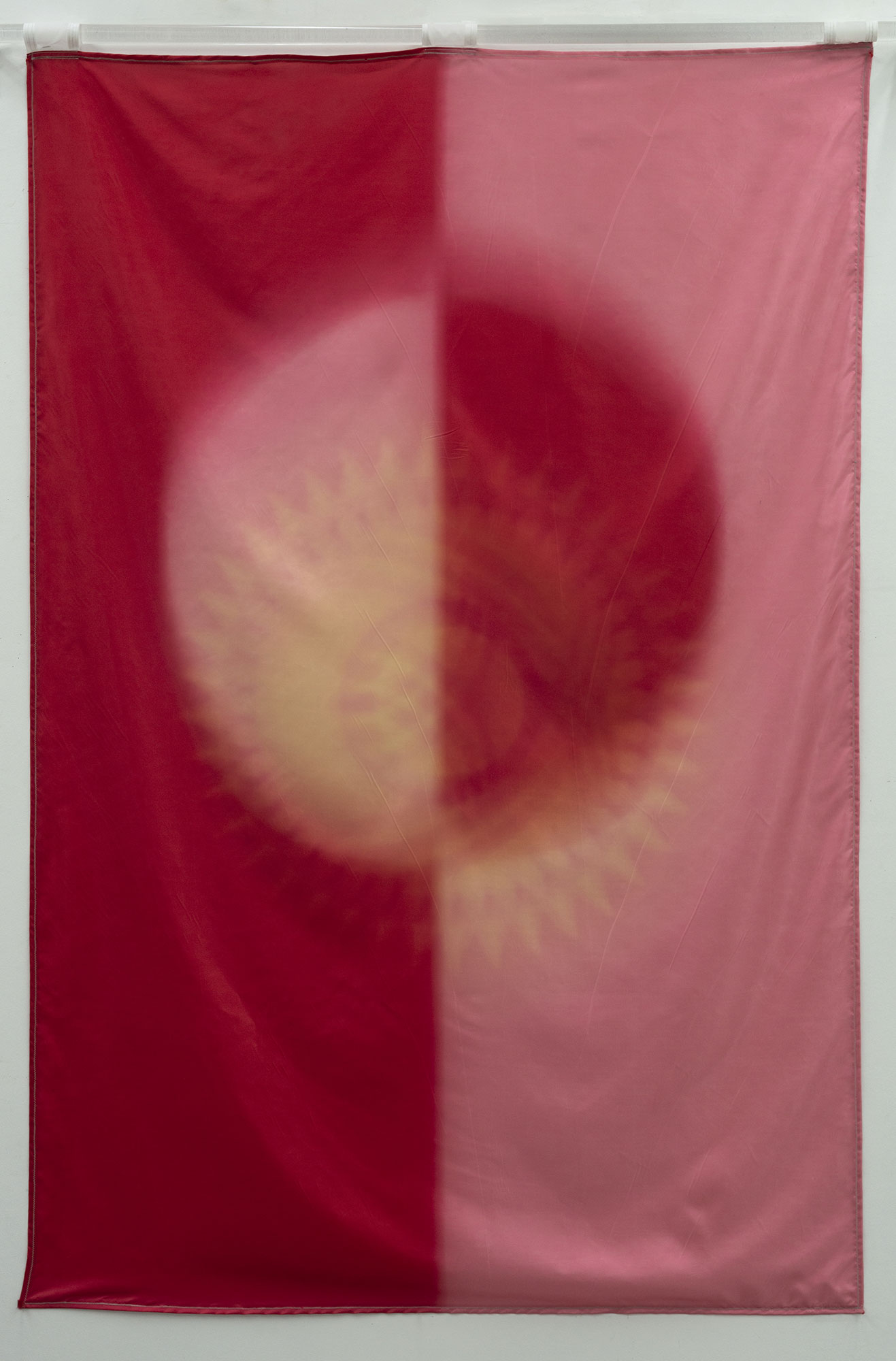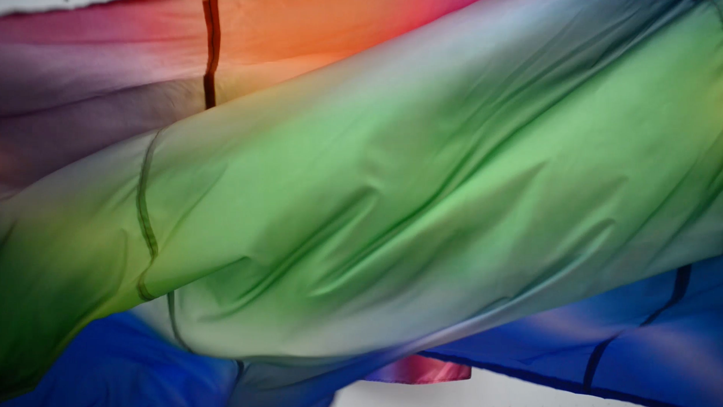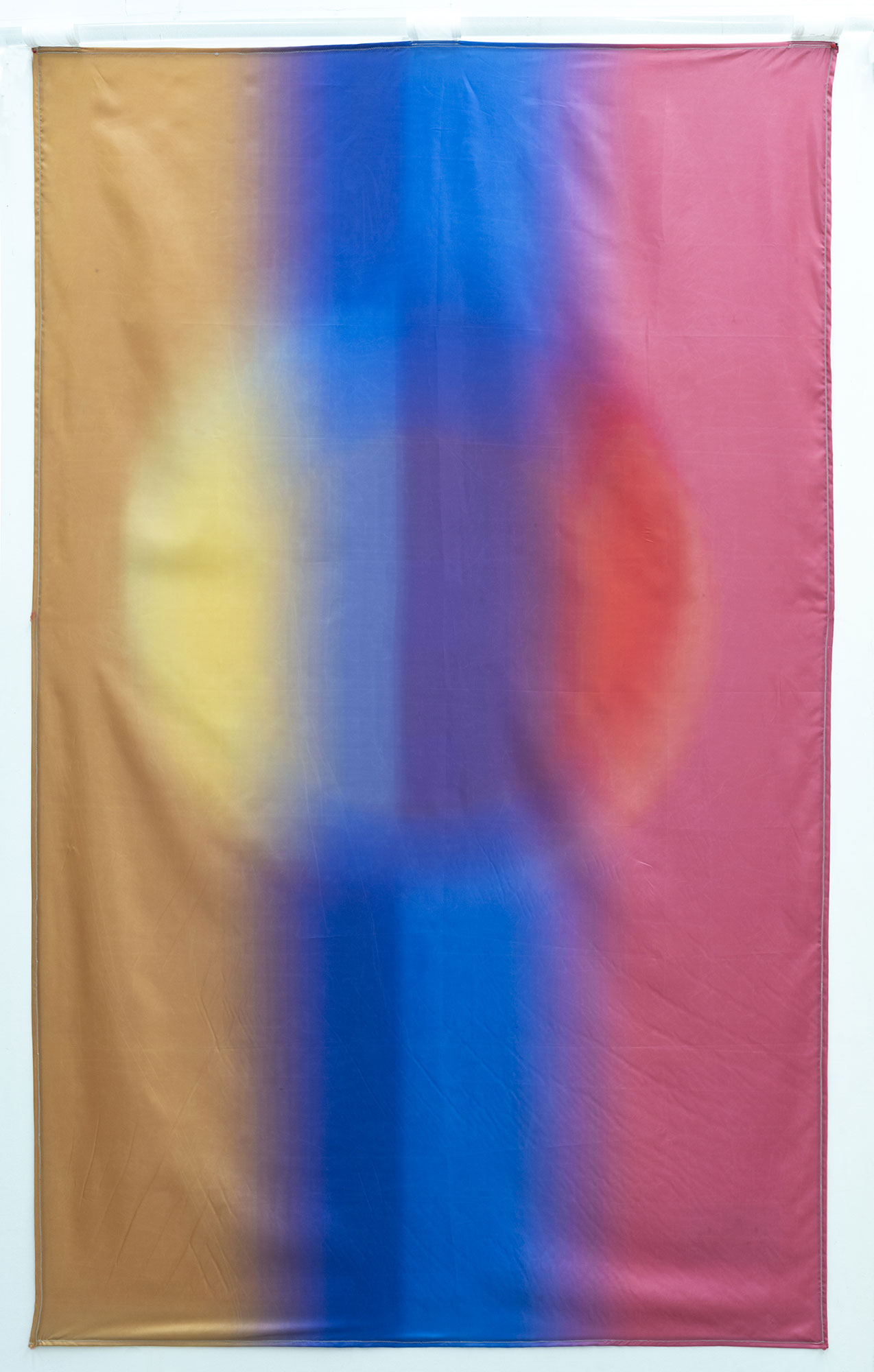 Three fans blow a large flag, animating it to twirl, twitch and billow. On the walls other flags hang, agitated by the currents of air that build up and swirl in the room. All the flags are hybrids of national flags, layers of colours and shapes bleeding into one another to the point of becoming unrecognizable. The central flag’s mesmerizing dance, heightened by the enclosed space, becomes a celebration of the blurring of identity where shape, colour and movement are in a constant permutation.