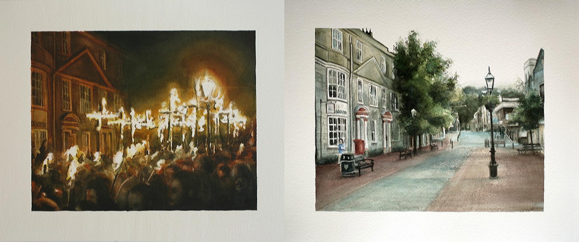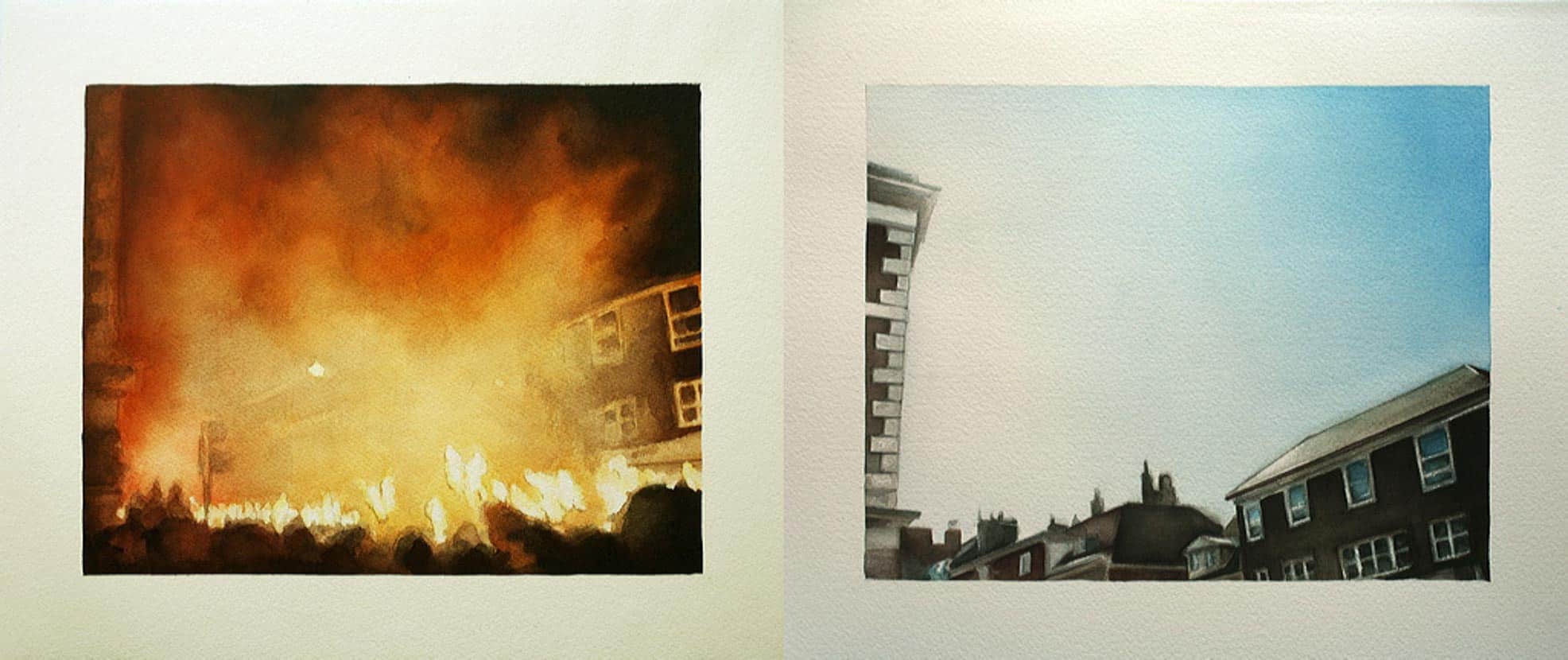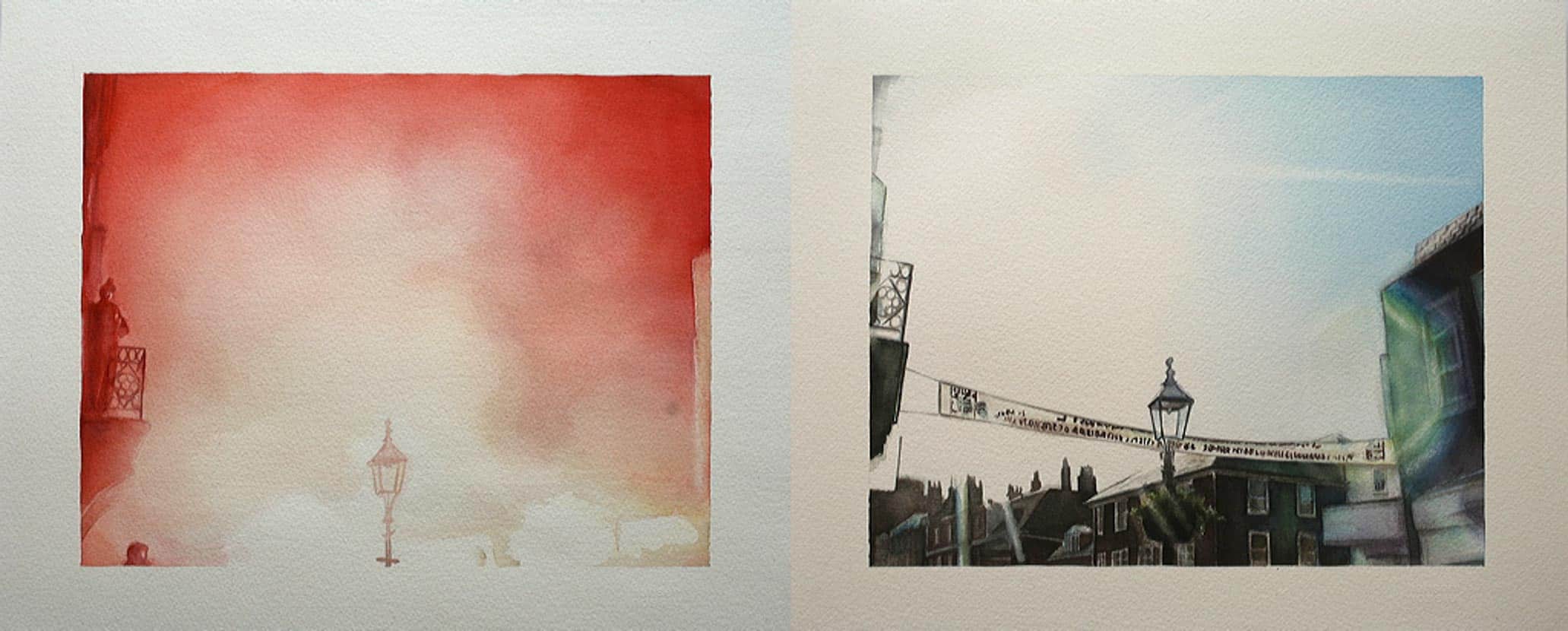 The Framework for this series is the annual Lewes fire procession, an anti-papal event held on Guy Fawkes Night, in which the East Sussex town commmorates the burning of 17 protestant martyrs. It is based on video work Hansen made in collaboration with Chris Dorley-Brown, which combined fortage of the procession night with another film of the same locations, shot by day six months later. Hansen then, in collaboration with painter Christoph Nissou, made these watercolour images based on pairs of night and day stills. The benign normality of the day and its apparent emptiness is invaded by the extraordinary violence of the night, and both are suspended with a poetic ambivalence that provokes the viewer to question which is more disturbing. The lightness and translucency of the watercolour, the working from light dark to contrasts with the violence of the images.