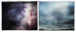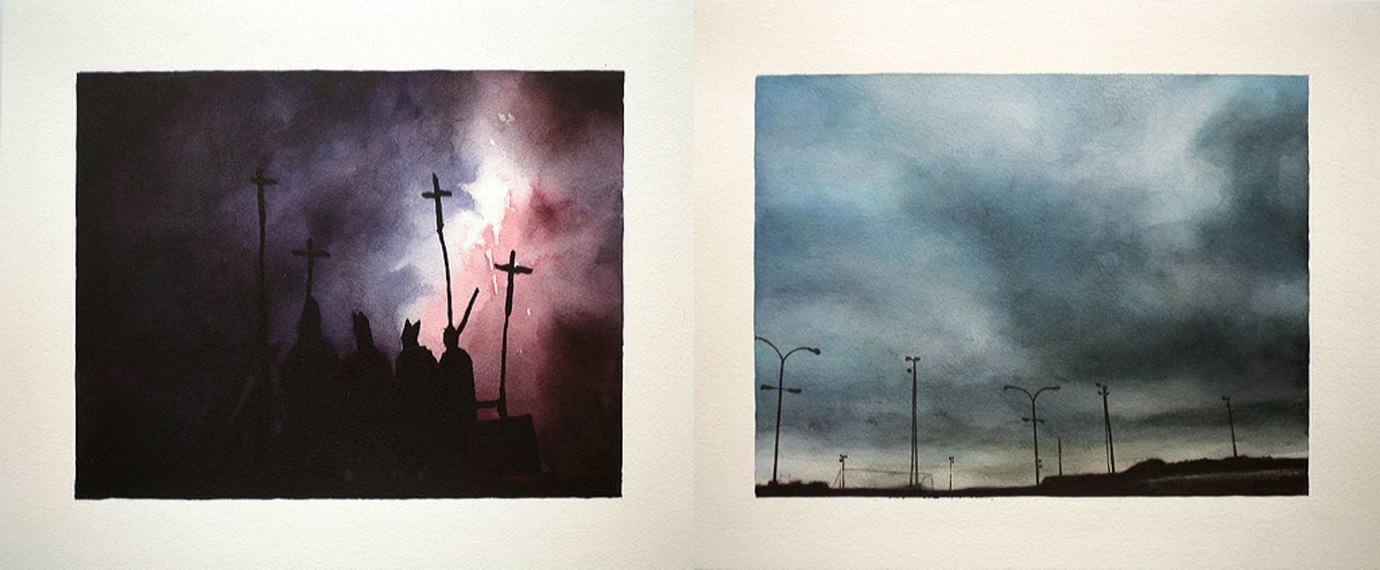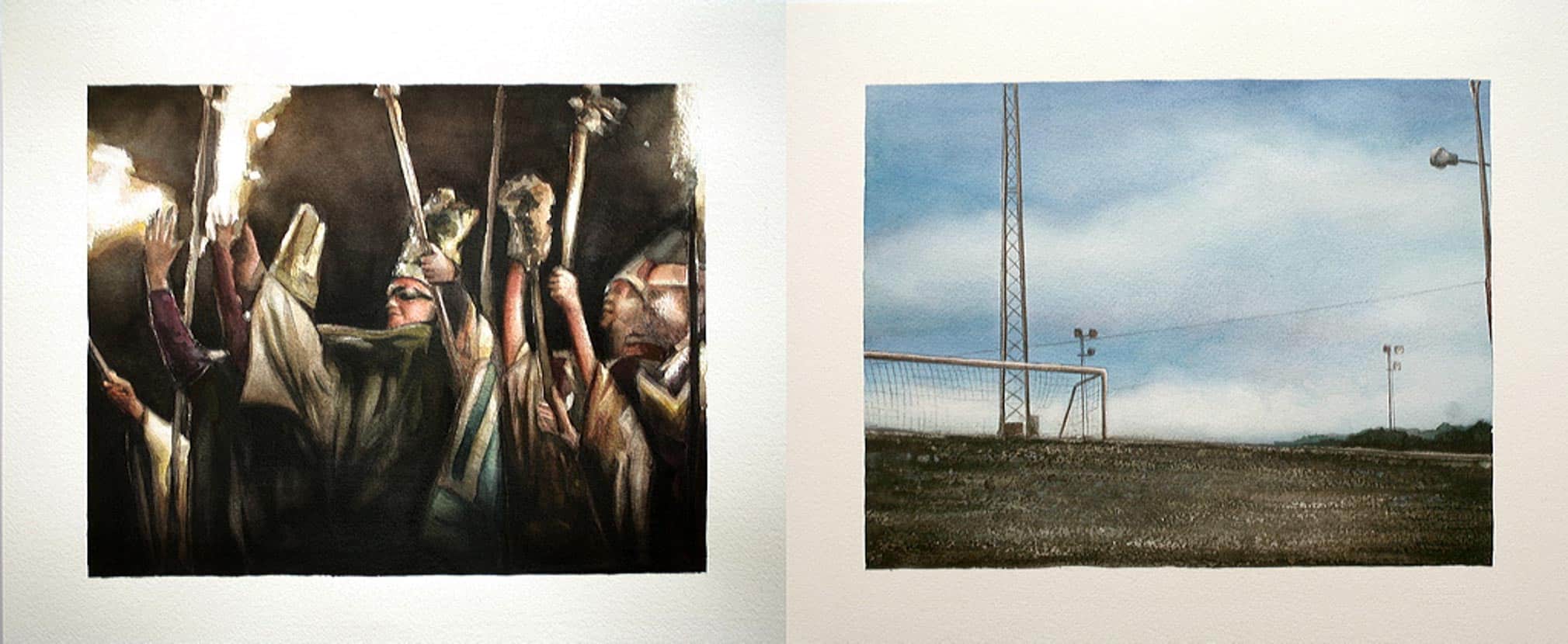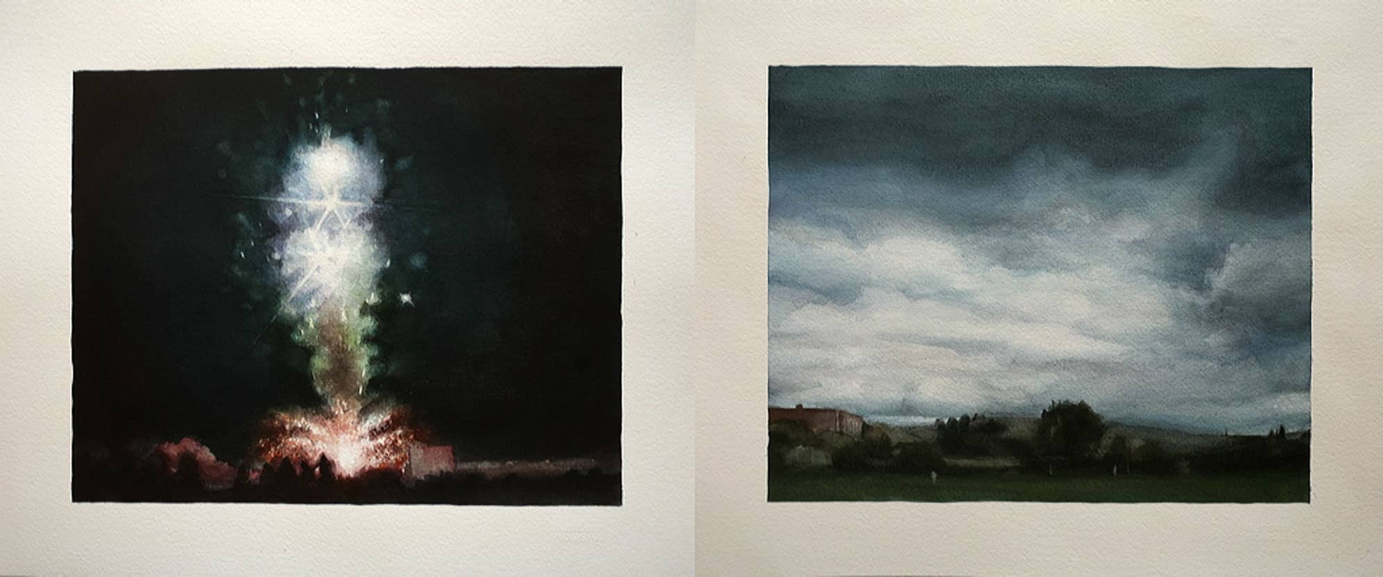 The Framework for this series is the annual Lewes fire procession, an anti-papal event held on Guy Fawkes Night, in which the East Sussex town commmorates the burning of 17 protestant martyrs. It is based on video work Hansen made in collaboration with Chris Dorley-Brown, which combined fortage of the procession night with another film of the same locations, shot by day six months later. Hansen then, in collaboration with painter Christoph Nissou, made these watercolour images based on pairs of night and day stills. The benign normality of the day and its apparent emptiness is invaded by the extraordinary violence of the night, and both are suspended with a poetic ambivalence that provokes the viewer to question which is more disturbing. The lightness and translucency of the watercolour, the working from light dark to contrasts with the violence of the images.