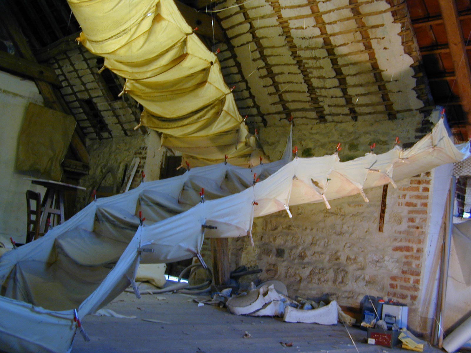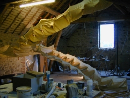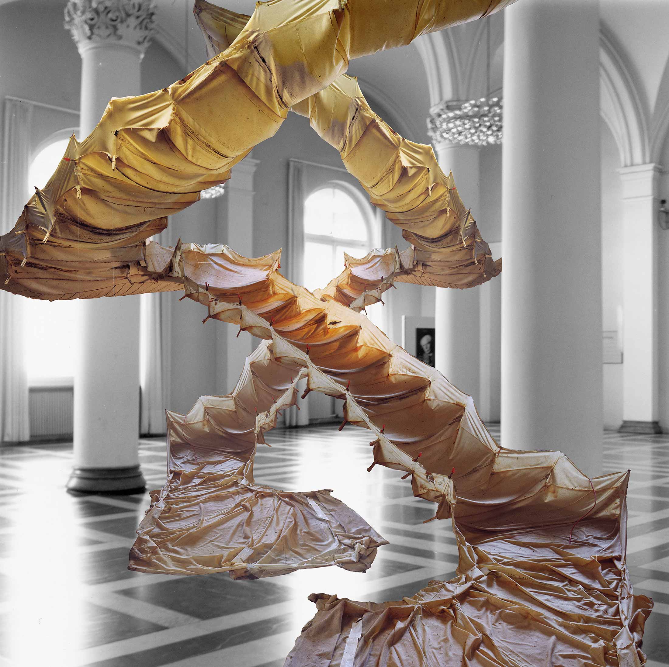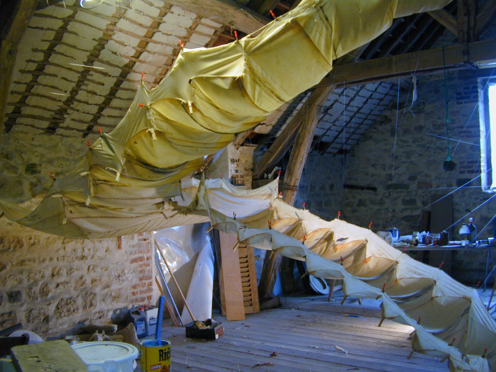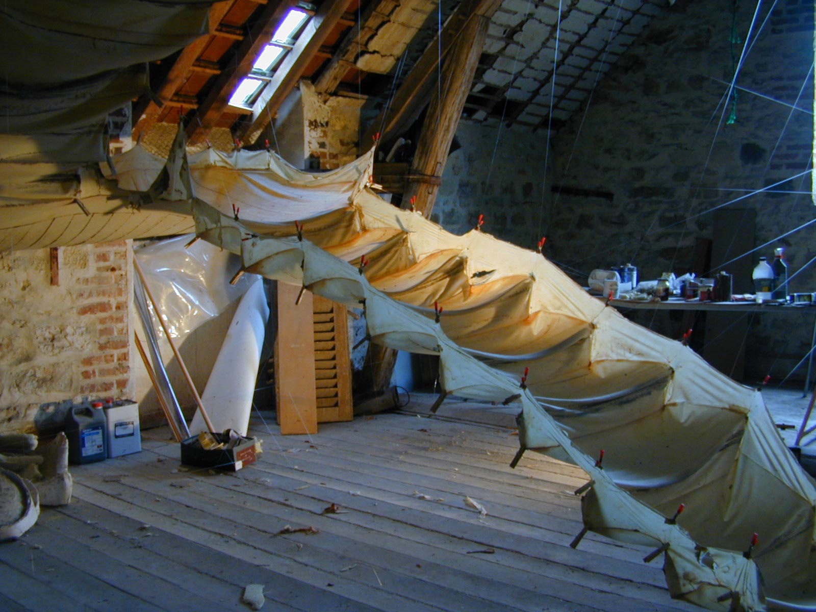 A thin latex mould of a staircase is suspended in space. It’s ambivalent nature is highlighted by the fragile and translucent skin, carrying traces of all the woodgrain, scratches and imperfections of the wooden steps; an object of the unsatisfiable desire of ascending the impossible.