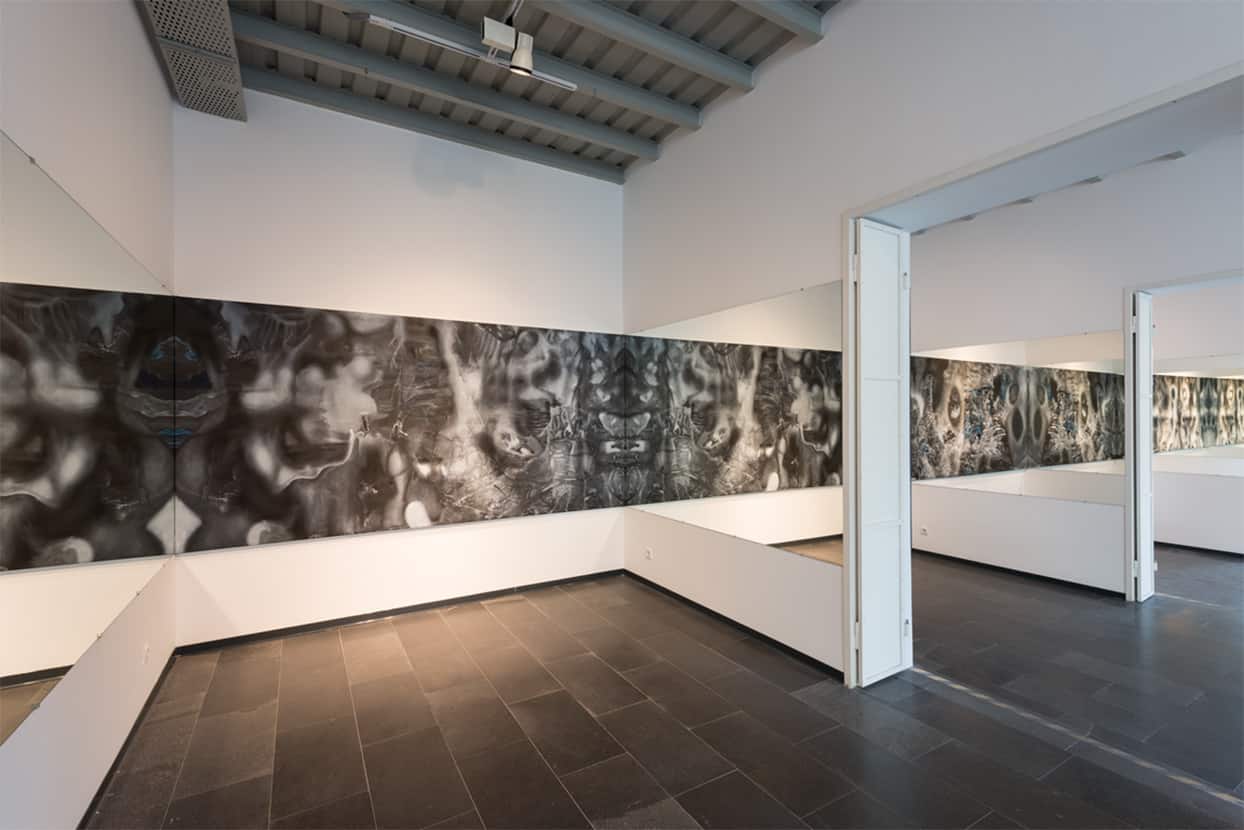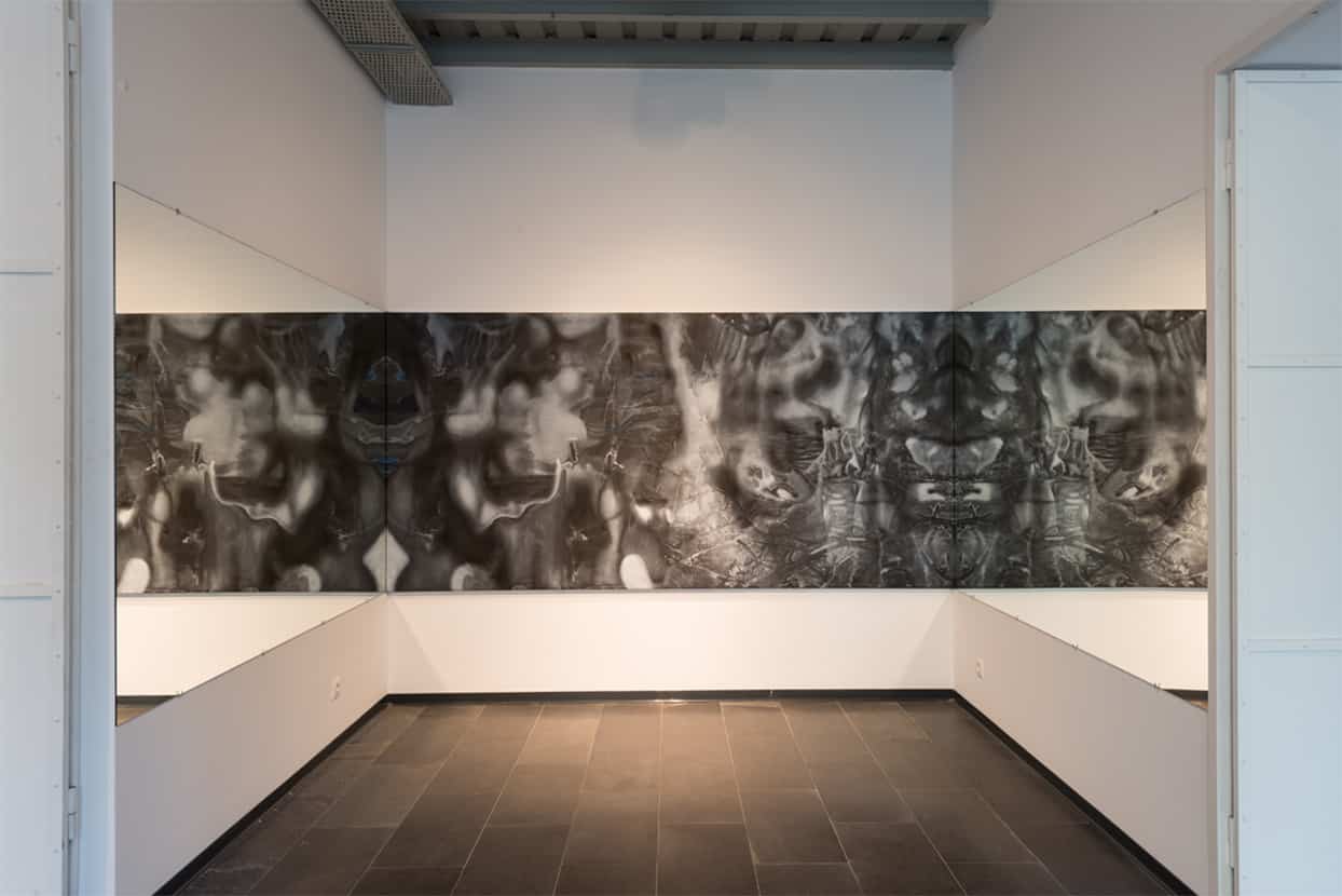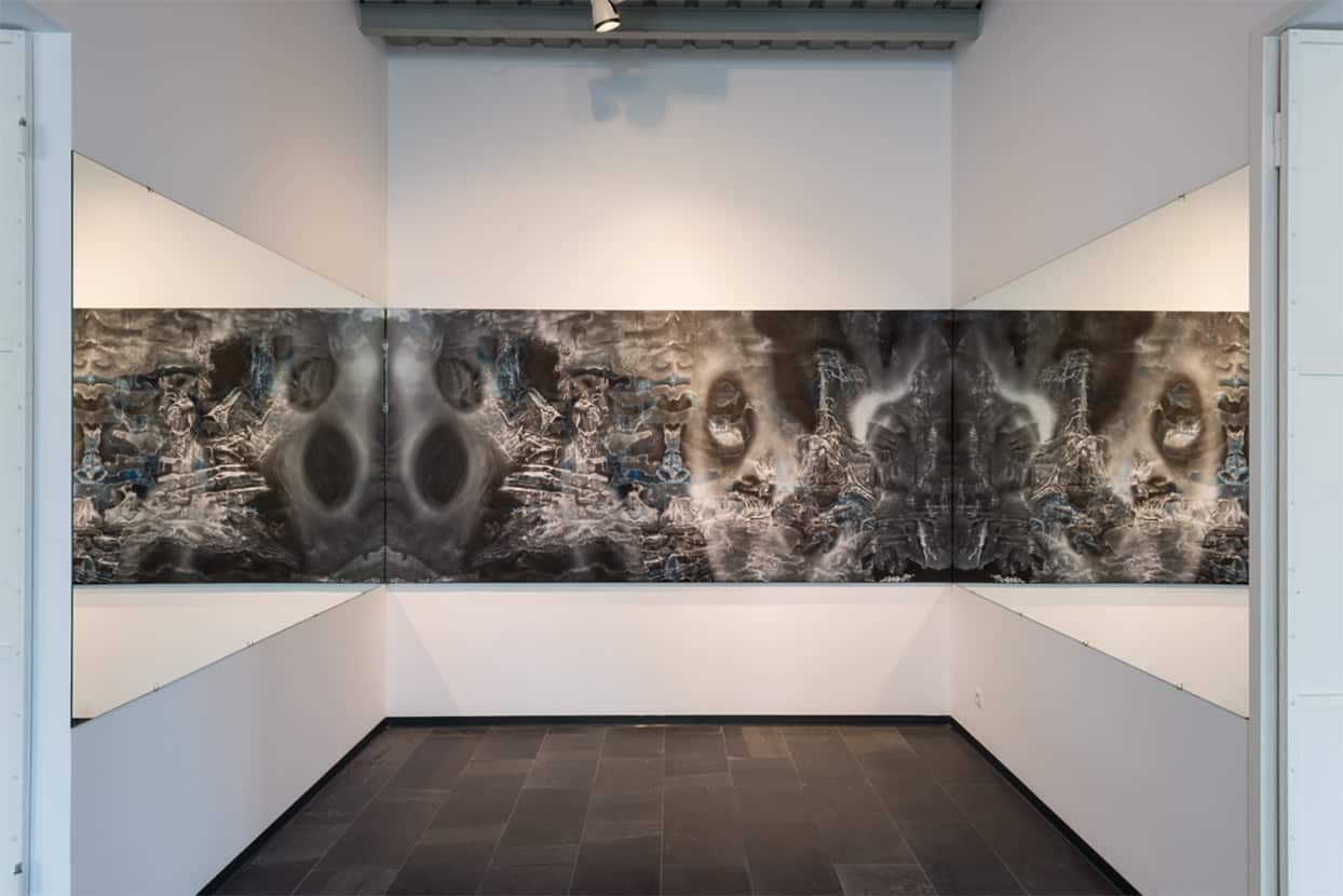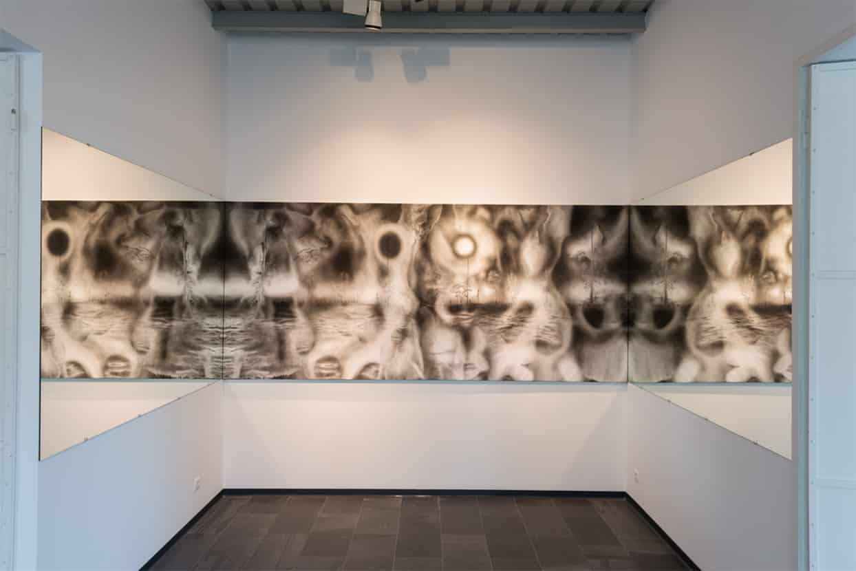 The same river twice is an installation of three large drawings, framed by mirrors to the left and right, each in its individual space making these paintings into infinite repetitive landscapes. Each space has an intimacy and a sense of immensity charging the experience of these pictures with an ambivalence that oscillates between the thrill of liberation and an imminent oppressiveness. When the viewer steps outside of the intimacy of the space she/he can see the drawings running into each other.