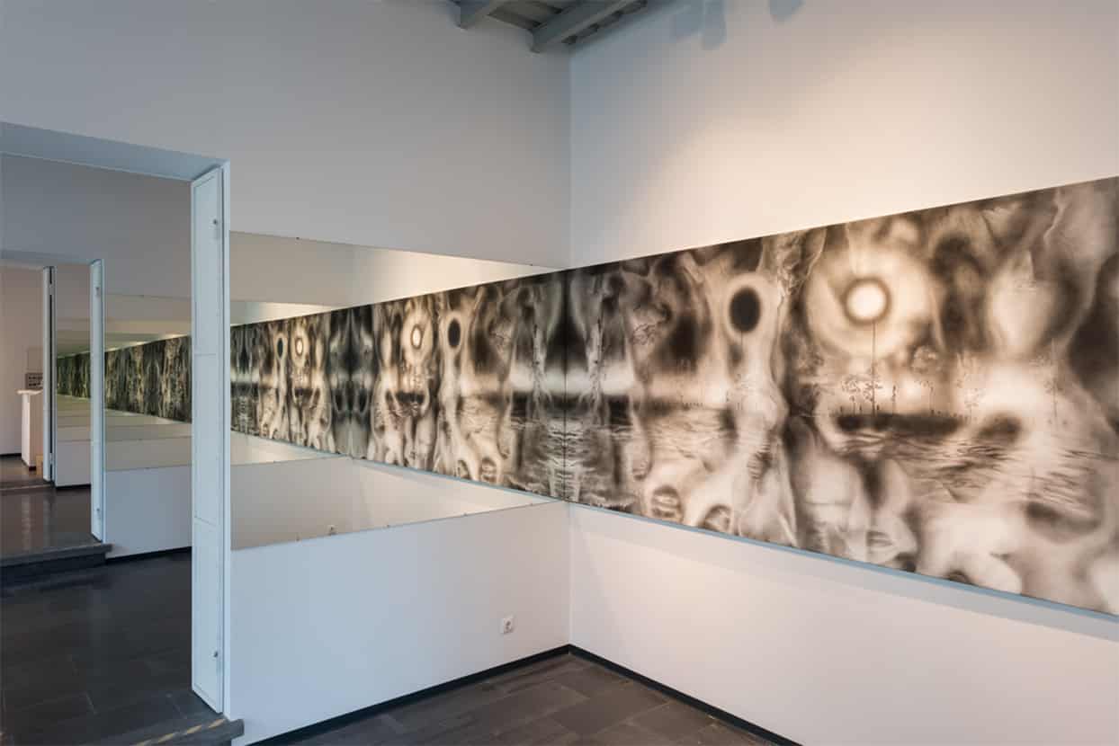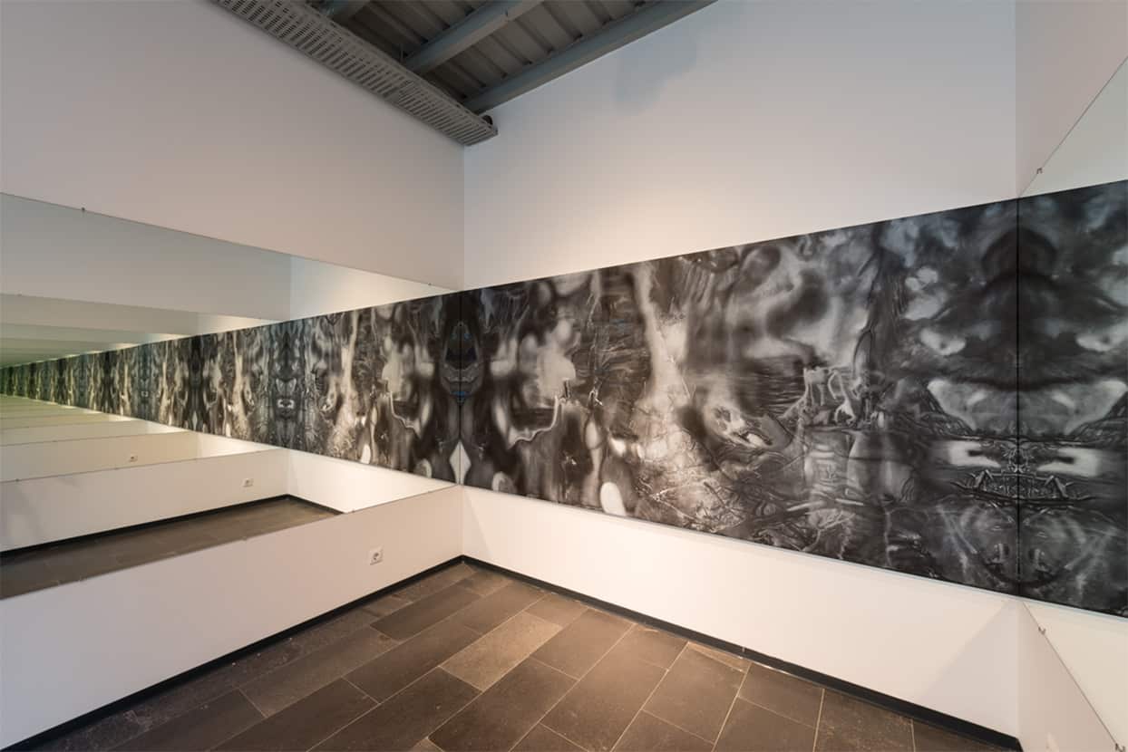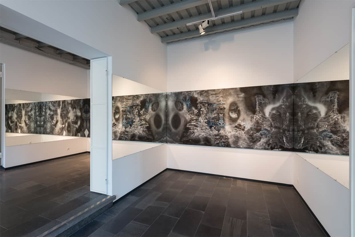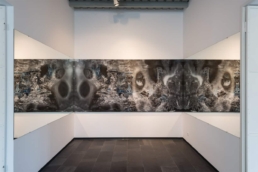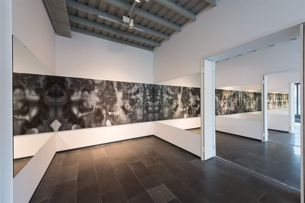 The same river twice is an installation of three large drawings, framed by mirrors to the left and right, each in its individual space making these paintings into infinite repetitive landscapes. Each space has an intimacy and a sense of immensity charging the experience of these pictures with an ambivalence that oscillates between the thrill of liberation and an imminent oppressiveness. When the viewer steps outside of the intimacy of the space she/he can see the drawings running into each other.